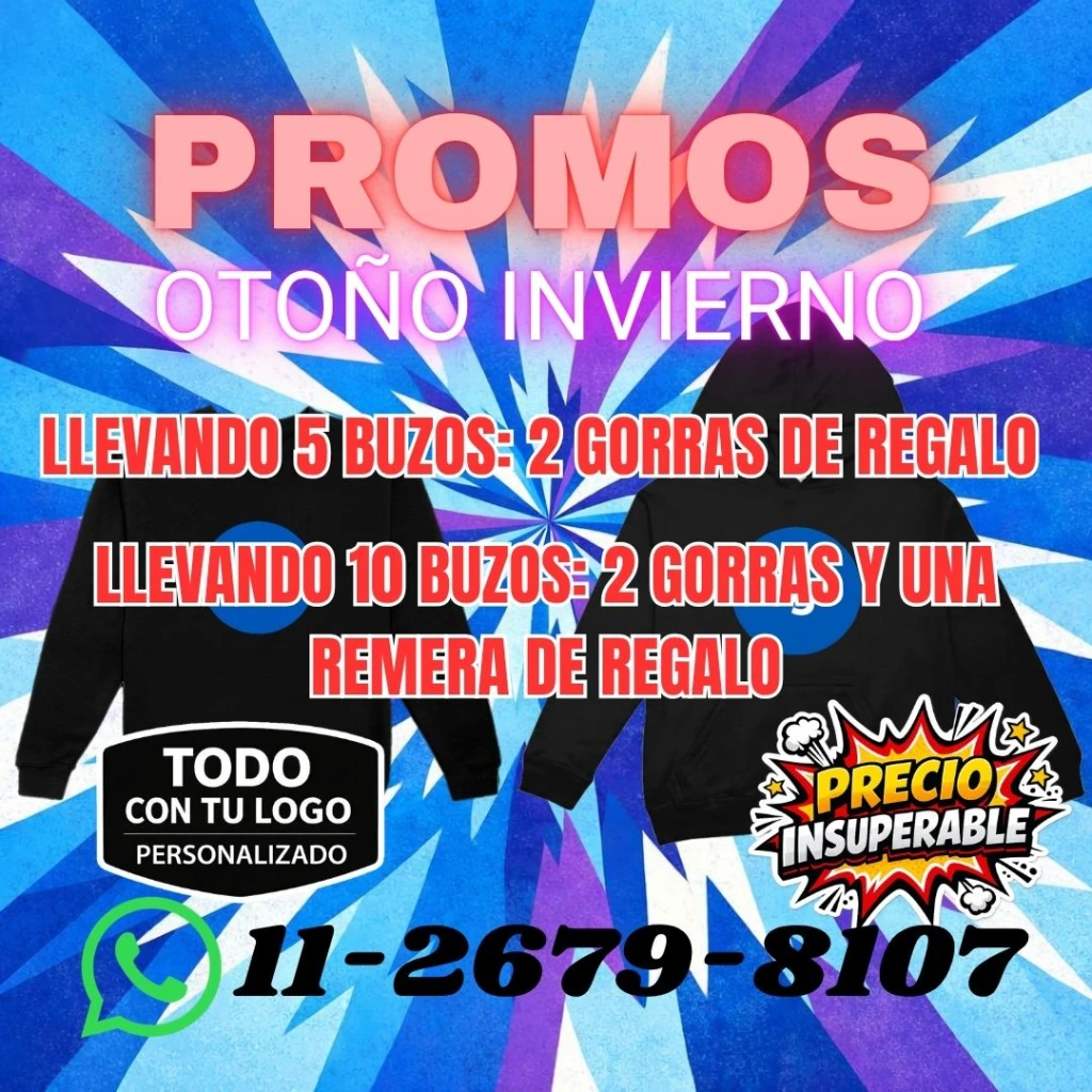 Promo de Buzos Personalizados Con la compra de 10 buzos friza invisible estampados en DTF con tu logo, te llevás de regalo 3 gorras y 1 remera.
